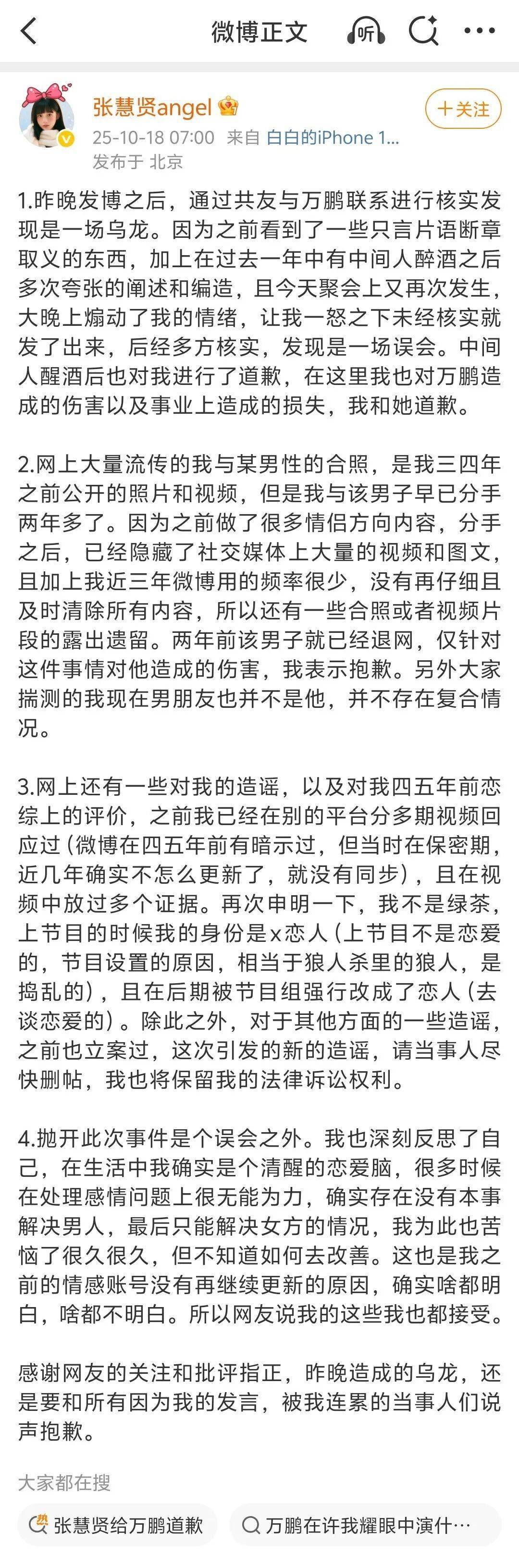 10月18日早晨7点,网红张慧贤(@张慧贤angel)发长文道歉,承认整件事是场“乌龙”。表示因为之前看到了一些只言片语断章取义的东西,加上在过去一年中有中间人醉酒之后多次夸张的阐述和编造,且今天聚会上又再次发生,大晚上煽动了我的情绪,让我一怒之下未经核实就发了出来,后经多方核实,发现是一场误会。中间人醒酒后也对我进行了道歉,在这里我也对万鹏造成的伤害以及事业上造成的损失,我和她道歉。