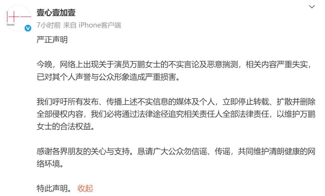 10月18日00:27,万鹏经纪公司@壹心壹加壹发布严正声明,强调指控为“恶意揣测”和“不实信息”,已对万鹏声誉造成严重损害,要求删除侵权内容并启动法律追责程序。